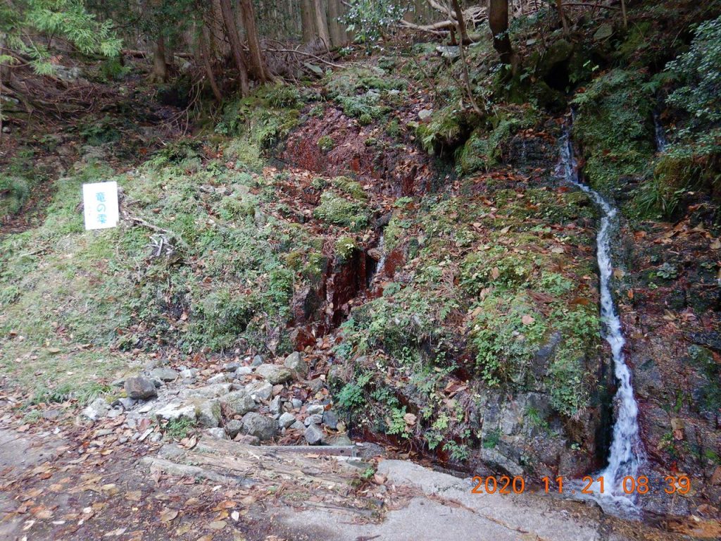 8:39 林道わきにあるこじんまりとした”竜の雫”滝、なかなか良いネーミング。