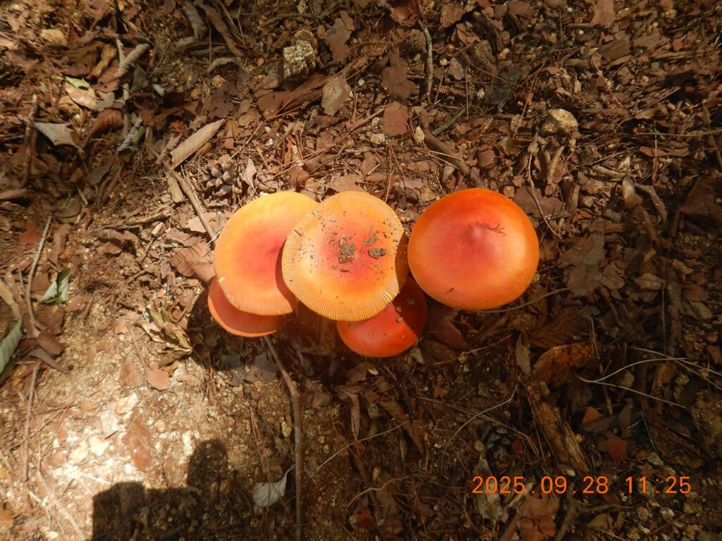 きれいなキノコ発見!!グーグル検索で調べると食用のタマゴタケと考えられますと出ました。あとベニテングタケとタマゴテングタケの毒キノコに似ているのでご注意と出ましたので持ち帰りは止めときます!!
